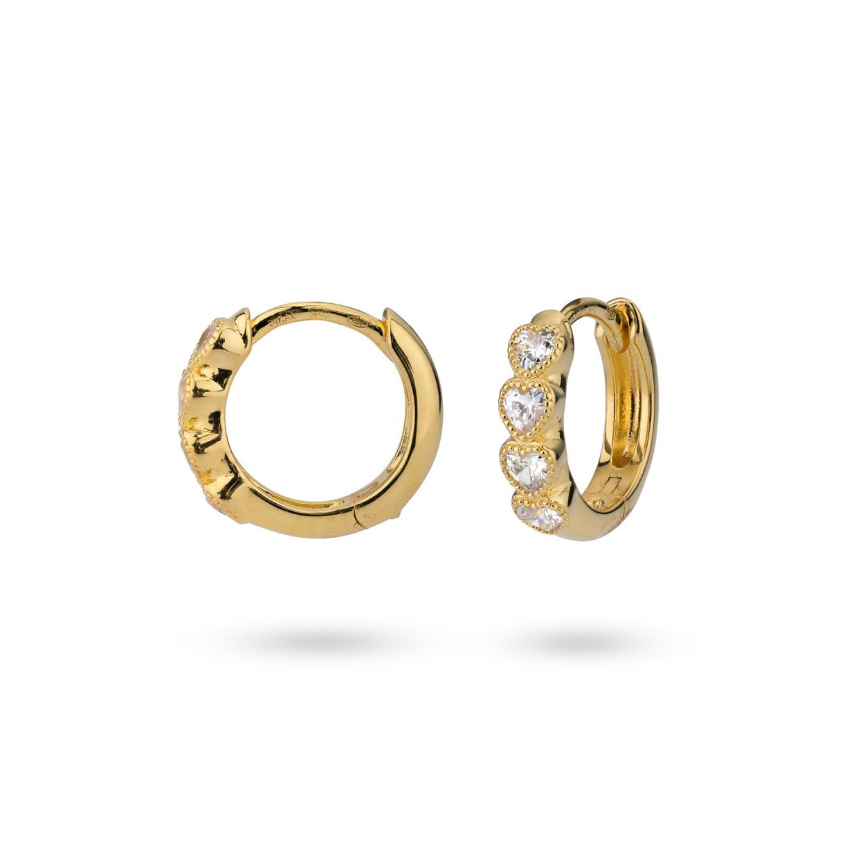 Deze leuke oorbellen van 24Kae zijn aan de voorkant gevuld met drie hartjes. De achterkant is glanzend. Ze zijn perfect te combineren met een van onze andere kleine oorbellen voor de beste earparty. Elk sieraad van 24Kae wordt met liefde en oog voor detail ontworpen door Kae Sutherland. Alle oorbellen van 24Kae hebben het authentieke kenmerk van een handgemaakte bedel met gravure. Details: - Diameter ring: 11 mm - Breedte hartjes: 3,1 mm Materiaal: - 925 Sterling zilver, voorzien van een 14k goudlaagje - Kubieke zirkonia stenen