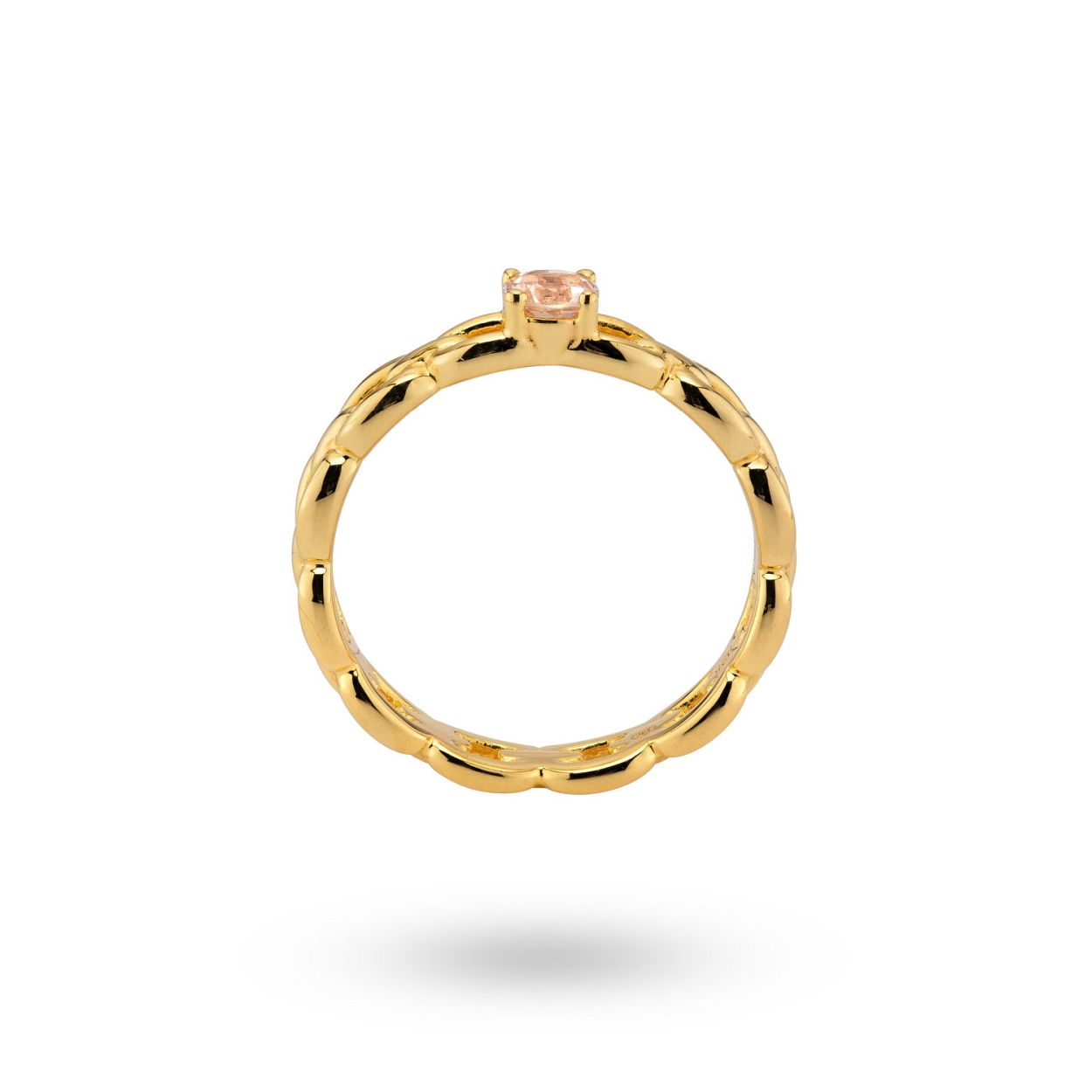Deze klassieke 24Kae ring heeft een mooie opengewerkte schakelstructuur met een lichtroze kleursteen. De ring is gemaakt van 925 sterling zilver verguld met 14 karaats goud. Alle 24Kae sieraden zijn met liefde en oog voor detail ontworpen door Kae Sutherland. Iedere 24Kae ring wordt gekenmerkt door haar echtheid door middel van een 24Kae gravering. Details: - Dikte band: 3.3 mm - Afmetingen steen: 3.7 mm Materialen: - 925 Sterling zilver, voorzien van een 14k gouden laagje - Cubic zirkonia steen